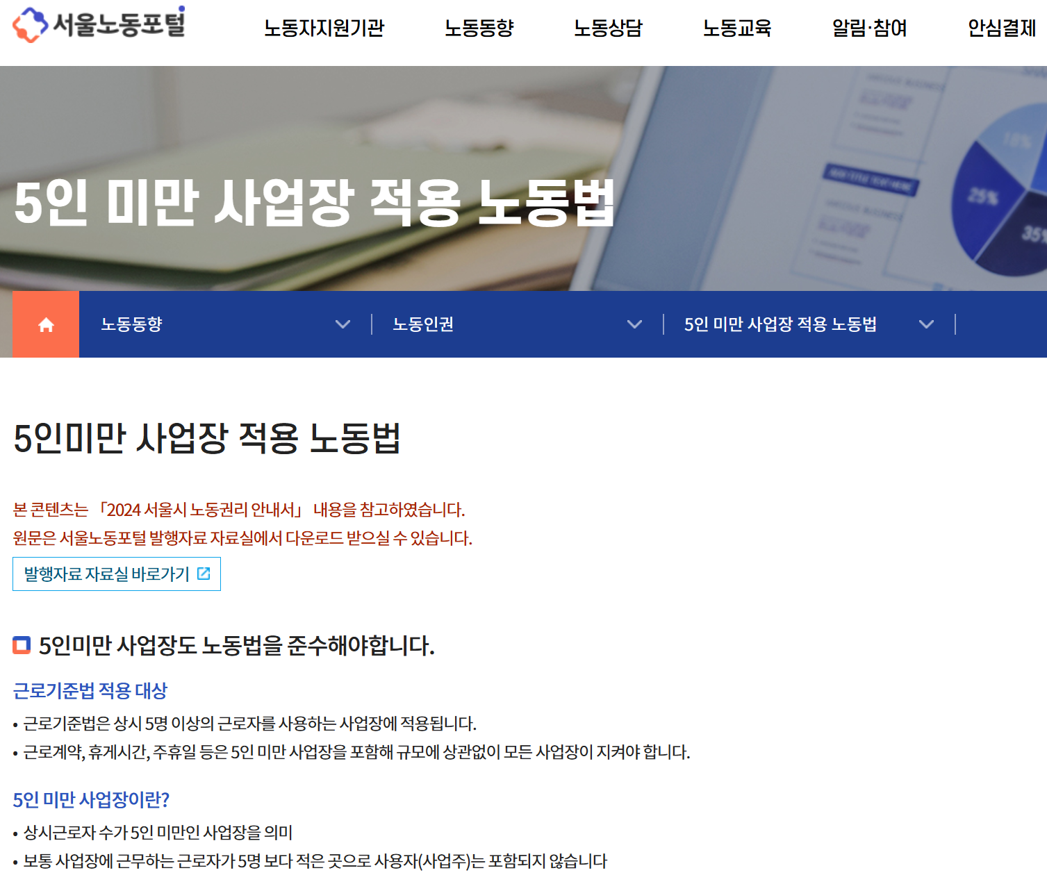 정부는 이러한 절차를 미리 중소기업, 소상공인들에게 안내하고자 [서울노동포털] 홈페이지를 통해 5인 미만 사업장 적용 노동법을 별도로 정리해두었습니다. |