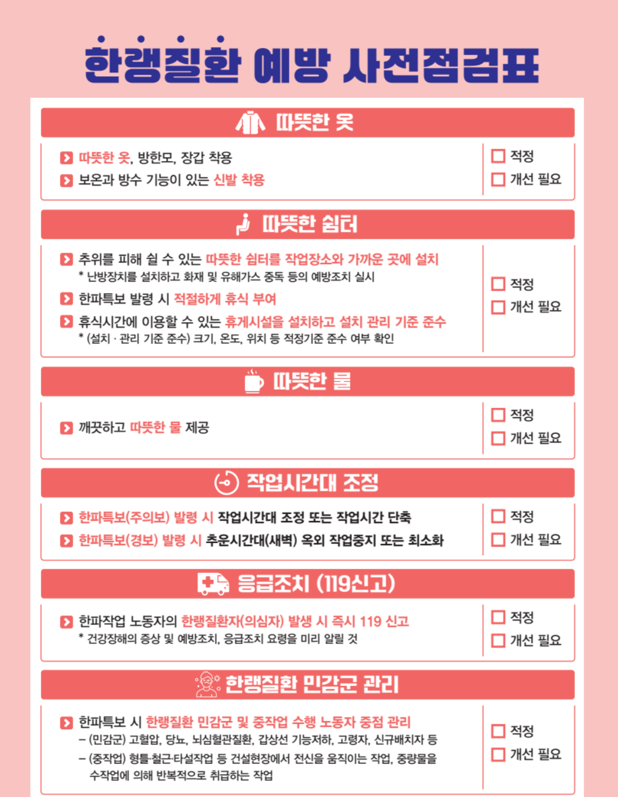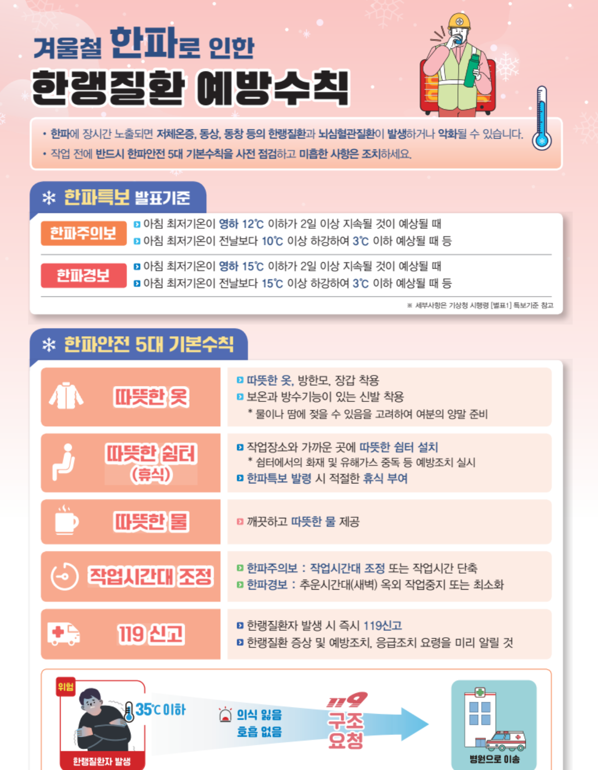 이에 따라 선제적 비상대응체계를 구축하고 한파 취약사업장을 집중관리하며, 건설노동자 등 취약 업종을 대상으로 적극적인 지도와 한랭 예방 보조용품을 지원한다고 합니다.