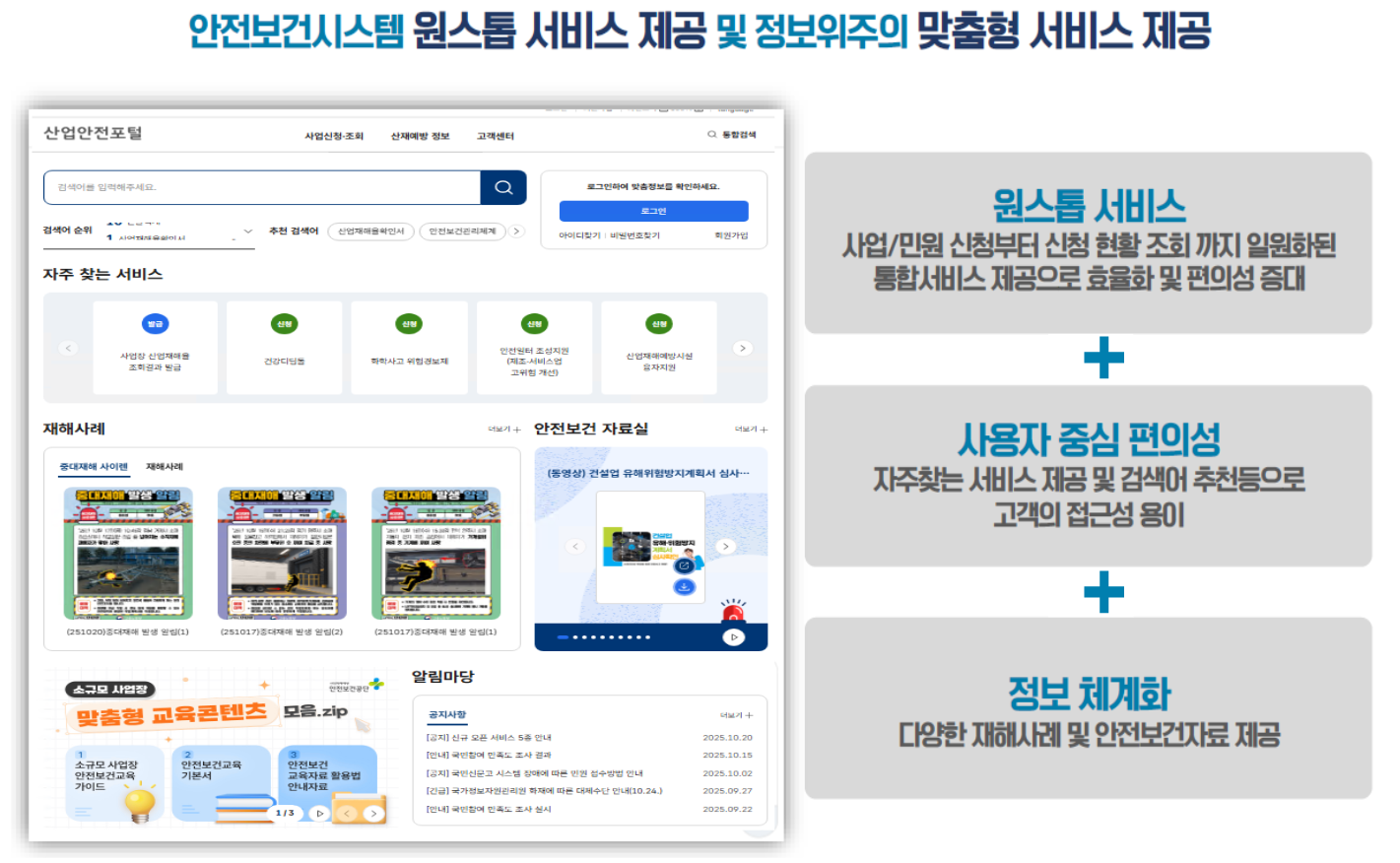 안전보건공단이 ‘산업안전포털’을 11월 17일 정식 오픈하면서, 산재예방과 안전보건 활동에 필요한 주요 서비스를 한 곳에서 편리하게 이용할 수 있게 되었습니다.