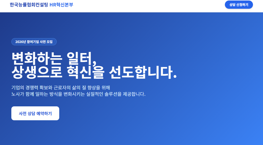 일터혁신 상생컨설팅은 중소·중견기업의 인사노무 고민과 법적 리스크 해소를 돕는 사업으로, 지금 2026년 일터혁신 상생컨설팅 사전상담을 접수 받고 있습니다!