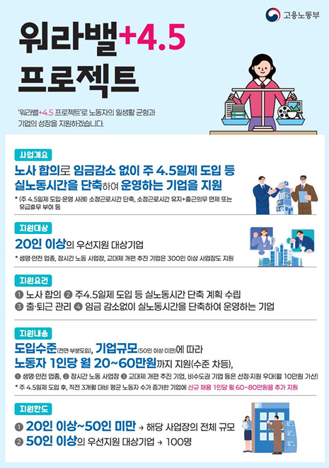 <워라밸 +4.5 프로젝트>는 노사 합의로 임금 감소 없이 주 4.5일제 도입 등 실노동시간을 단축하여 운영하는 기업을 지원하여 주 4.5일제의 자발적 추진을 확산시키고자 지원하는 사업입니다.